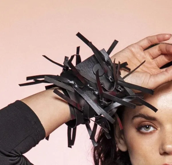 This bold yellow cuff bracelet is a true statement piece, designed with layered strips that create a dynamic, fringe-like texture. The playful and edgy design gives it a modern, avant-garde appeal, while the snap closure ensures a secure and comfortable fit. Perfect for adding a pop of color and artistic flair, this cuff pairs beautifully with both casual and fashion-forward looks.