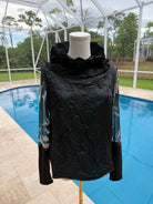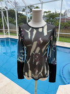 Turn heads with this sheer, long-sleeve mesh top featuring a striking abstract print. Designed with a form-flattering silhouette, this lightweight piece combines artistic flair with effortless versatility. The soft mesh fabric moves with you, while the bold patterns in ivory, plum, and slate tones create an expressive, modern statement. Finished with solid black cuffs for added contrast, this top layers beautifully over camisoles or under blazers for a contemporary twist.