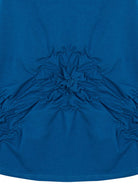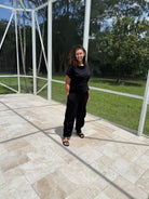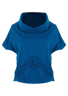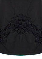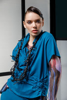 This black short-sleeve top brings effortless elegance with an artistic twist. Crafted with a soft, fluid fabric, it features a gathered ruched detail at the waist that creates a flattering, cinched silhouette. The asymmetrical drape adds depth and movement, making it more than just a basic tee. Perfect for dressing up or down, this piece pairs well with statement pants or laid-back denim for a versatile, modern look.