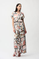 Create a coordinated statement look by pairing with the matching Joseph Ribkoff Recycled Satin Abstract Print Boxy Top With V-neckline-261308 for a sophisticated matching set. Style the sash tied at the waist for definition, or remove it for a more relaxed silhouette. Pair with a fitted solid top and heels for evening elegance, or dress down with a simple tee and flats for elevated casual wear.