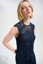 Elevate your wardrobe with the Joseph Ribkoff Signature Guipure Soutache Trumpet Dress, a stunning statement piece that combines timeless elegance with modern sophistication. This exquisite dress features luxurious guipure soutache fabric that creates beautiful texture and visual interest, making it perfect for special occasions, evening events, or any moment when you want to feel extraordinary.