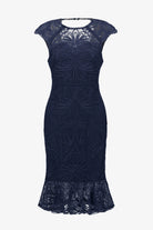 The flattering trumpet silhouette gracefully skims your figure before flaring at the hem, creating a feminine and elegant shape that moves beautifully with you. The crew neckline offers classic appeal while the open back detail adds an unexpected touch of allure, striking the perfect balance between refined and romantic. Delicate cap sleeves provide just the right amount of coverage while maintaining the dress's sophisticated aesthetic.