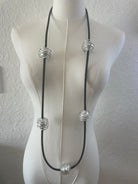 This modern long necklace features a sleek black cord adorned with bold silver-toned rings, spaced evenly for a striking geometric look. Lightweight and versatile, it adds a contemporary edge to both casual and dressy outfits. The length makes it perfect for layering or wearing as a statement piece on its own.