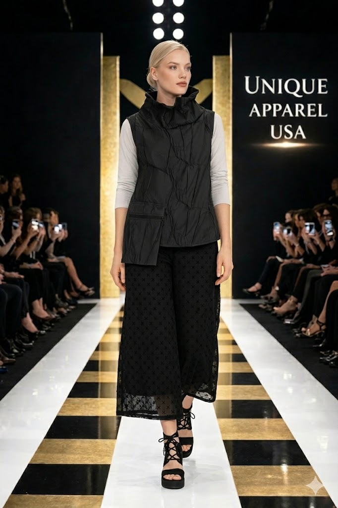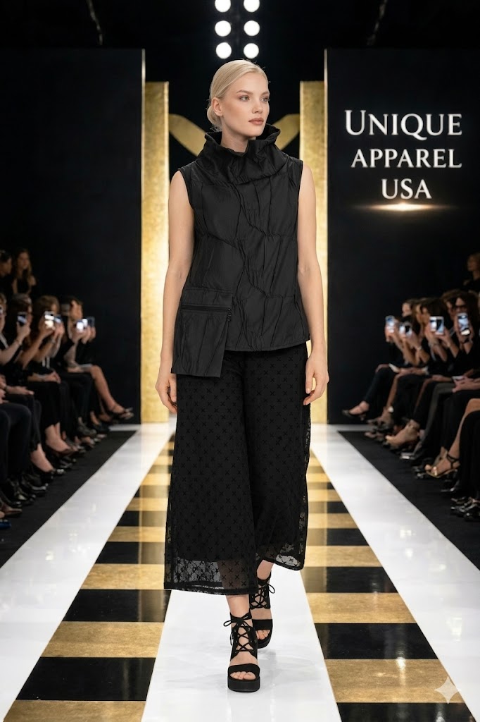 - Sheer overlay with X-pattern design - Adds texture and sophisticated movement