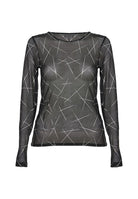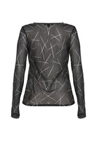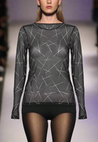 Sleek, modern, and effortlessly edgy — this sheer mesh top adds a graphic twist to your layering wardrobe. Crafted in a lightweight black mesh, it features an all-over linear pattern in soft white for a dynamic, contemporary look. The fitted silhouette, long sleeves, and classic crew neckline make it ideal for layering under sleeveless dresses, blazers, or bold vests.