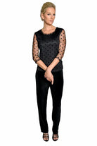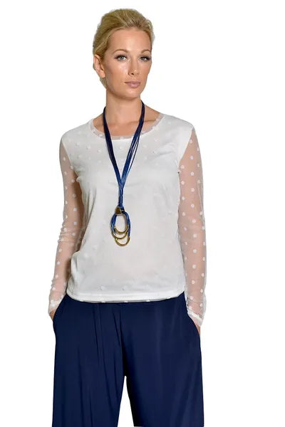 This elegant top features a sophisticated mix of textures, combining a smooth body with sheer sleeves for a refined, modern look. The three-quarter sleeves are crafted from delicate mesh adorned with playful polka dots, adding visual interest and a touch of charm. A rounded neckline provides a classic, flattering finish. Perfect for evening outings or special occasions, this top pairs effortlessly with tailored pants or skirts for a chic, elevated ensemble.