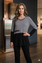 This long-sleeve top features a modern, layered design with a smooth, lightweight drape. It includes a rounded neckline with a subtle tiered detail for added dimension. A small decorative zipper accent on the front adds a contemporary touch, while the relaxed silhouette offers comfortable, easy wear. Its clean, structured paneling creates a stylish and versatile look suitable for both casual and polished outfits.