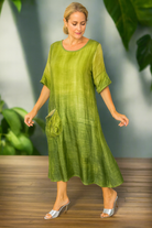 A delicate white floral appliqué at the shoulder adds a touch of femininity and modern charm, while the asymmetrical handkerchief hem enhances movement and visual interest. The relaxed silhouette, three-quarter sleeves, and front pocket details make this dress perfect for resort wear, daytime events, or warm-weather evenings.