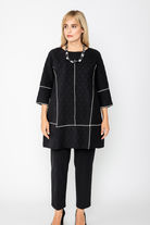 This textured shift dress combines modern artistry with timeless elegance. Crafted in a raised circular jacquard fabric, it offers rich dimension and a refined, structured look. Contrast piping outlines the silhouette with clean, architectural lines, highlighting the dress’s flattering shape and adding a touch of contemporary sophistication.