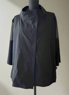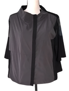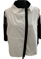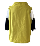 This fashion forward jacket from Sun Kim features a 3 color combination of chartreuse, white and denim with its 3/4 length sleeves, angled zipper and high collar!