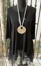 This flirty fun tunic is perfect for any occasion! Dress it up with a gorgeous piece of jewelry and make a statement with its mesh handkerchief hemline!