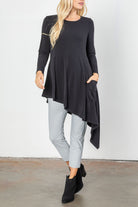 Designed with a bold, fashion-forward asymmetric hem and practical, functional pockets. Your new go-to top—effortlessly stylish and ready for anything your day brings