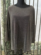 Features a wide neckline, wasit length hem, and over sized sleeves.