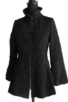 Crafted from beautifully textured fabric with a subtle floral-inspired pattern, this jacket brings timeless charm with a modern twist. Its flattering silhouette, stand collar, and statement circle-zip detail make it a versatile piece you can dress up or down.