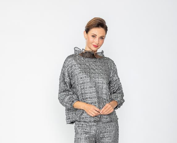 IC Collection brings back the elegance you adored with this beautifully reimagined piece. Crafted in a rich, textured  fabric, this top features a dramatic sheer chiffon asymmetrical collar and soft bell sleeves for a sophisticated silhouette. The relaxed fit offers effortless style and comfort, perfect for both special occasions and elevated everyday looks.