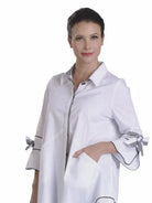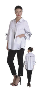 This gingham trimmed blouse has beautiful 3/4 length trumpet sleeves with a bow tie accent and a lengthening pleat in the back!