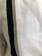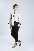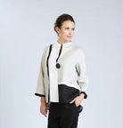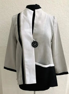This fashion forward linen jacket from IC Collection has a tri-tone of grey, black and white that feature 3/4 length sleeves, a high-low hemline and a one button close front with a silver beaded stripe down the front!