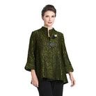 Features a Jacquard fabrication, stand collar, geo grid motif, elbow sleeve, and a one button closure.