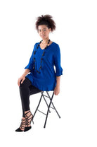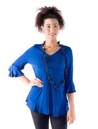 Adorable V-neck tunic with ruffles ob the 3/4 length sleeves and bottom hemline!