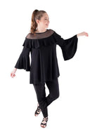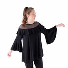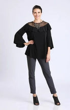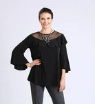 Loving this flirty fun tunic from IC Collection! It features a sheer mesh surrounding the rounded neckline and shoulders with a ruffle overlay, side pockets and 3/4 length bell sleeves!