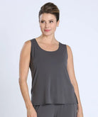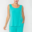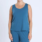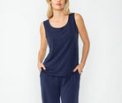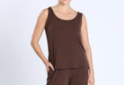 The ensemble showcases a sleeveless scoop-neck top with a relaxed silhouette and a straight hem that falls just below the waist. An elegant overlay detail enhances the look, adding a refined touch of sophistication.