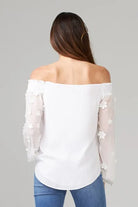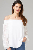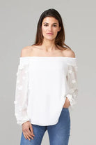 Off-the-shoulder top designed by Joseph Ribkoff in a relaxed fit, has a full-length sheer sleeve detailed with fabric flowers, accordian elastic detail at the shoulder and rounded hemlines fall at the hip.