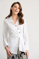Asymmetrical front hem and a faux front tie. This signature Joseph Ribkoff crisp shirt is the perfect go-to wardrobe essential, for the woman with a more modern take on a traditional shirt. The gorgeous gathering in the front adds a special little detail.