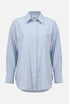 Crafted from lightweight Tencel, this woven striped blouse features a boxy silhouette and hidden button placket. All-over iron-on details add a unique touch to this casual, unlined piece.