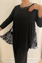 Features crew neck line, side inserts of with black & white print fabric for an added touch.