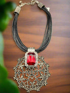 This dramatic statement necklace features a bold rectangular red Swarovski crystal, framed in silver detailing and set against an intricate antique-style filigree pendant. The ornate metalwork creates a vintage, regal look, perfectly balancing elegance and boldness. Strung on multiple strands of real leather cords, this piece is both striking and unique. A true one-of-a-kind treasure designed to make a lasting impression.