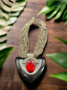 This one-of-a-kind statement necklace features a radiant red Swarovski crystal set on a striking heart-shaped black pendant, symbolizing passion and strength. The pendant is complemented by layered silver chains, adding a touch of elegance and edge. Crafted with precision and real Swarovski crystal, this necklace blends timeless romance with bold modern design. Perfect for making a powerful impression on any occasion.