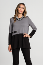 This long-sleeve top features a modern, layered design with a smooth, lightweight drape. It includes a rounded neckline with a subtle tiered detail for added dimension. A small decorative zipper accent on the front adds a contemporary touch, while the relaxed silhouette offers comfortable, easy wear. Its clean, structured paneling creates a stylish and versatile look suitable for both casual and polished outfits.