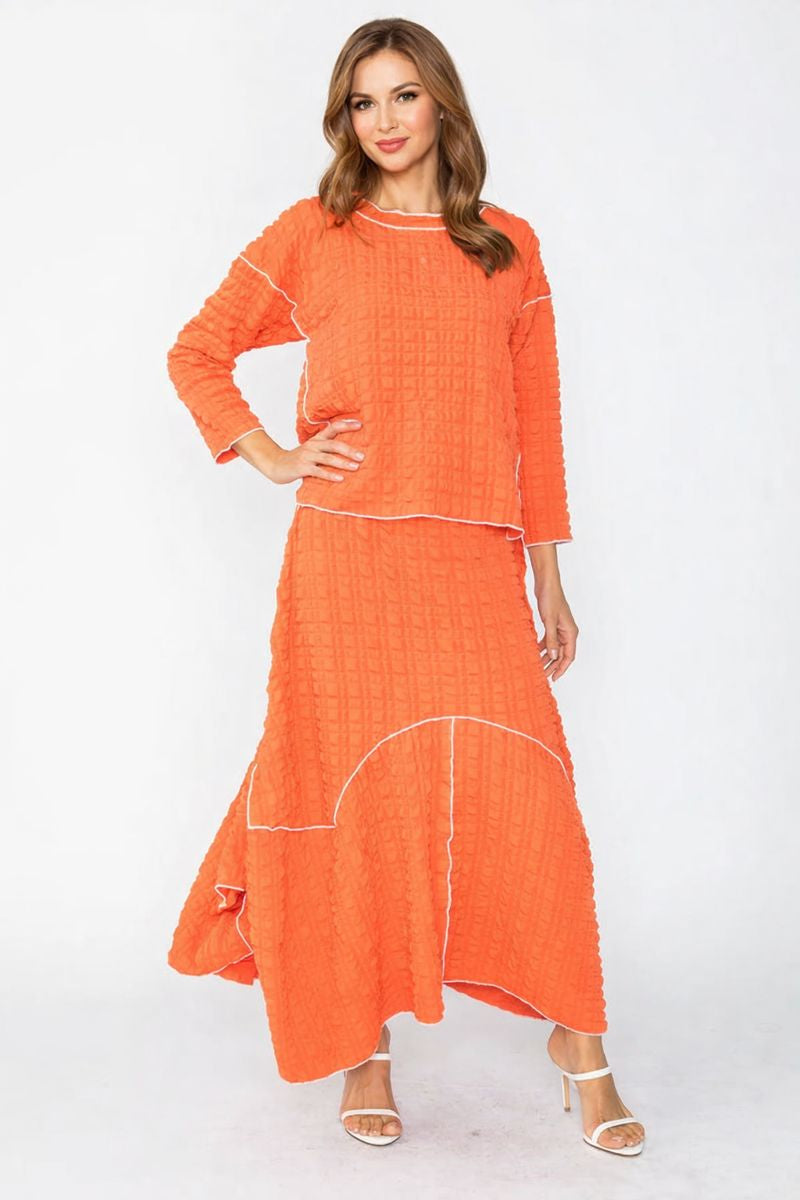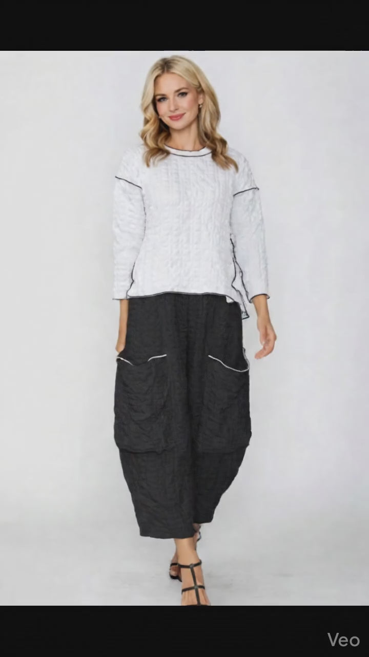 Made from a flexible, easy-care fabric, this textured top offers a comfortable fit with gentle structure, making it perfect for both casual and polished looks. Side slits at the hem provide added movement and versatility, while the contrast trim detailing adds a refined finishing touch.