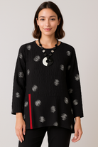 Elevate your look with this beautifully crafted mixed-texture tunic, designed for effortless style and all-day comfort. The crinkled solid bodice pairs perfectly with the artistic brushstroke print throughout the sleeves and lower panel, creating a modern, gallery-inspired contrast. A bold vertical red accent adds just the right touch of contemporary flair.