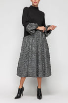 A sophisticated midi dress blending modern elegance with artistic detail. The top features a sleek black bodice with a high neckline and long sleeves, transitioning seamlessly into voluminous bronze textured fabric on the skirt and sleeve cuffs. The asymmetrical waistline adds a contemporary flair, while side pockets bring comfort and practicality. Perfect for both formal events and stylish everyday wear.