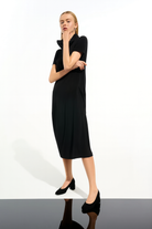 A sporty twist on a cocoon classic. This silky knit dress features a structured memory funnel collar with drawstring detail, balanced by soft gathers and a relaxed fit that falls just below the knee.