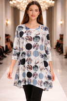 Make a bold yet sophisticated statement with this eye-catching tunic. Featuring a relaxed A-line silhouette, this piece showcases a dynamic mix of abstract circular prints in soft tones of black, blue, and marbled neutrals. Designed with a classic round neckline and elbow-length sleeves, it offers both style and ease. The lightweight knit fabric drapes beautifully, making it a perfect choice for year-round wear. Pair it with your favorite leggings or slim trousers for a polished, artistic look.