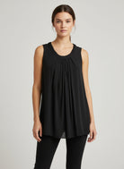 This elegant black sleeveless blouse features a relaxed, flowy silhouette that drapes beautifully for a flattering fit. The soft fabric and gathered pleats around the neckline add subtle texture and sophistication, making it perfect for both casual and dressy occasions. Lightweight and breathable, it pairs effortlessly with jeans, skirts, or tailored pants — ideal for warm weather or layering under a jacket or cardigan. A timeless wardrobe essential for effortless style and comfort.