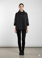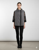 - Edgy Details: Angled zipper closure and high collar add contemporary flair